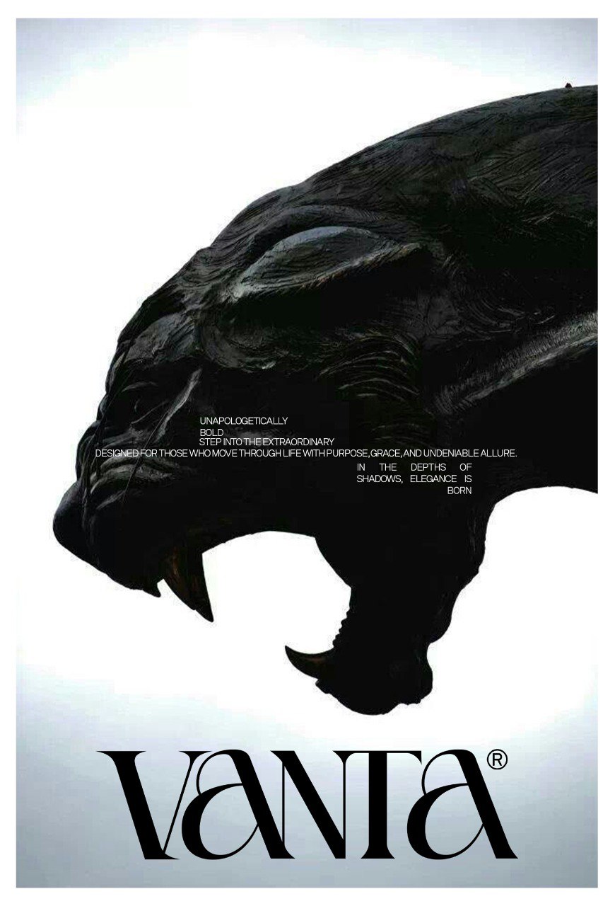 VANTA IS A CONCEPTUAL FASHION BRAND INSPIRED BY THE BLACK PANTHER AND DARK AESTHETICS. IT REPRESENTS STRENGTH, MYSTERY, AND DOMINANCE THROUGH BOLD TYPOGRAPHY AND MINIMAL DESIGN, USING BLACK AS ITS CORE VISUAL IDENTITY.